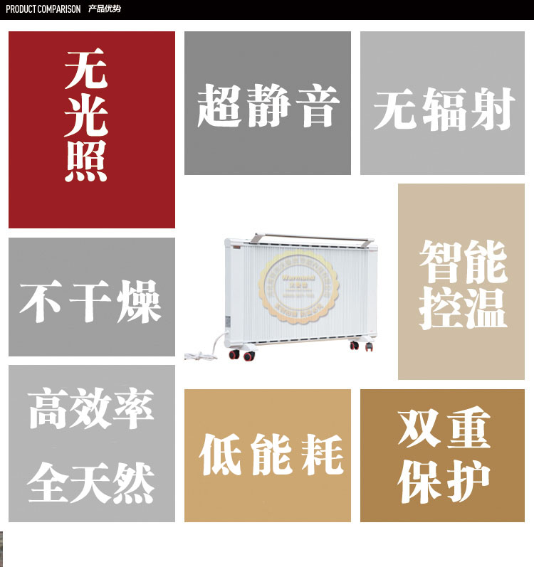 優(yōu)勢(shì)二:舒適!碳晶遠(yuǎn)紅外電暖器使用中無(wú)“小太陽(yáng)”光照污染問(wèn)題,無(wú)空調(diào)或者熱風(fēng)機(jī)噪音、揚(yáng)塵問(wèn)題。
